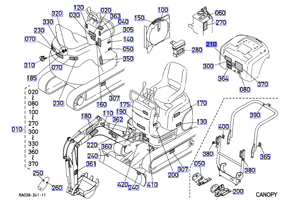 210 op de overzichtstekening, sticker gevaar, niet starten met schroevendraaier Kubota 6919857390 || 69198-57390