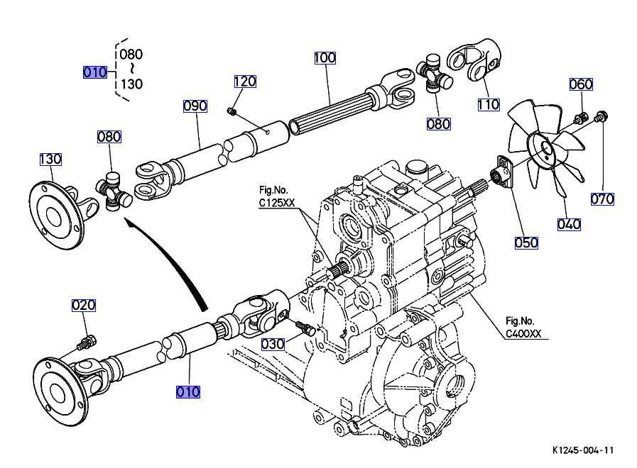 010 op de overzichtstekening, originele aandrijfas compleet Kubota K125313514 || K1253-13514