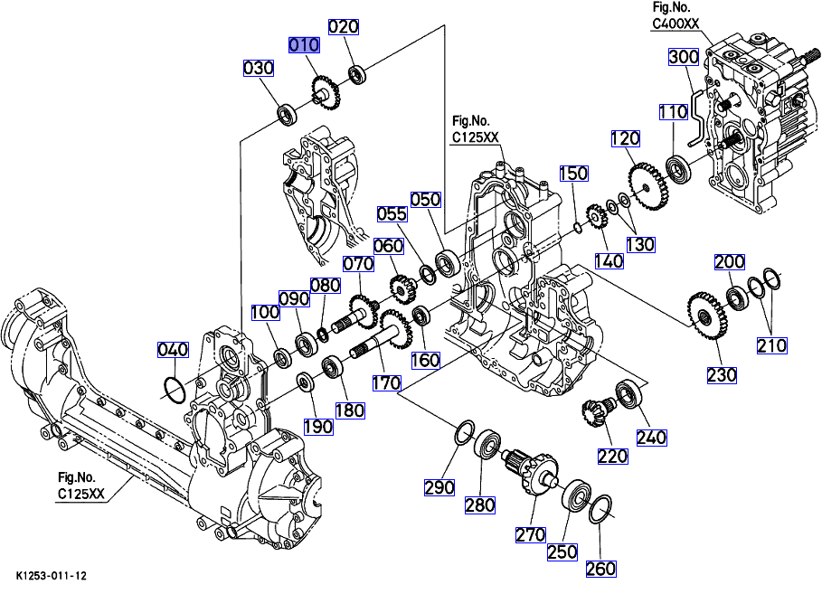 010 op de overzichtstekening, as met tandwiel origineel Kubota k125314240 || k1253-14240