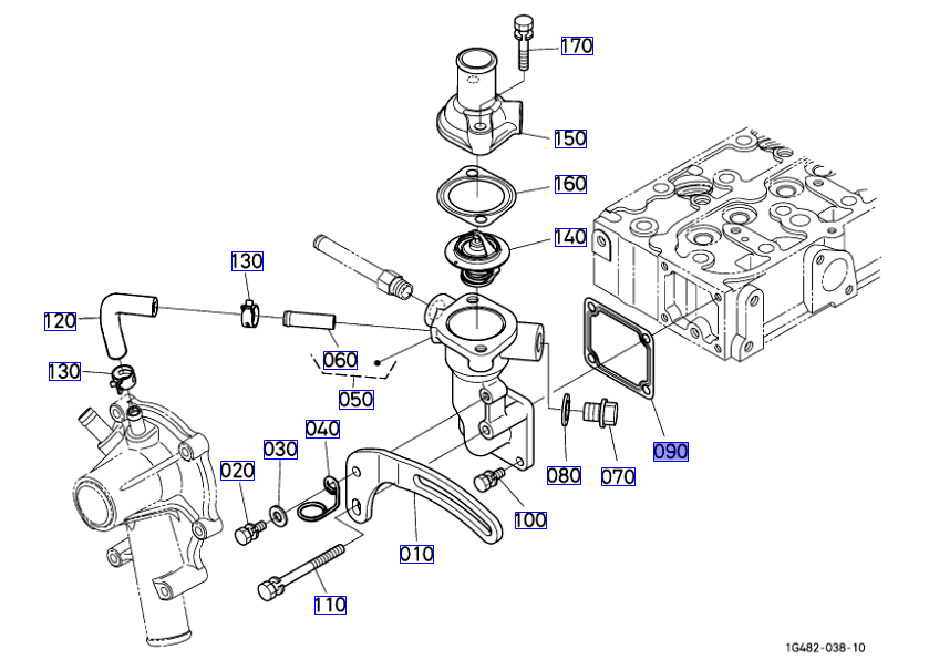 090 op de overzichtstekening, originele pakking voor tussen het thermostaathuis / cilinderkop Kubota 1626472920 || 16264-72920
