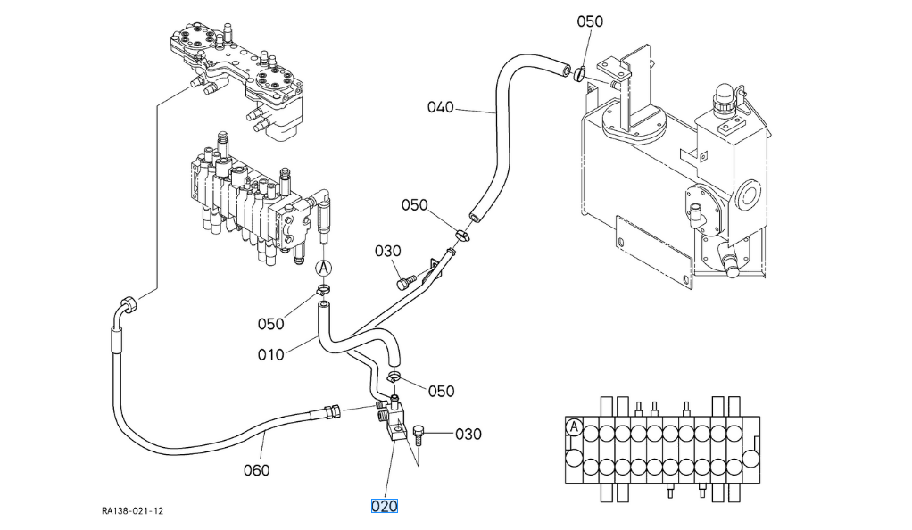 020 op de overzichtstekening, originele retourleiding Kubota RA13163292 || RA131-63292