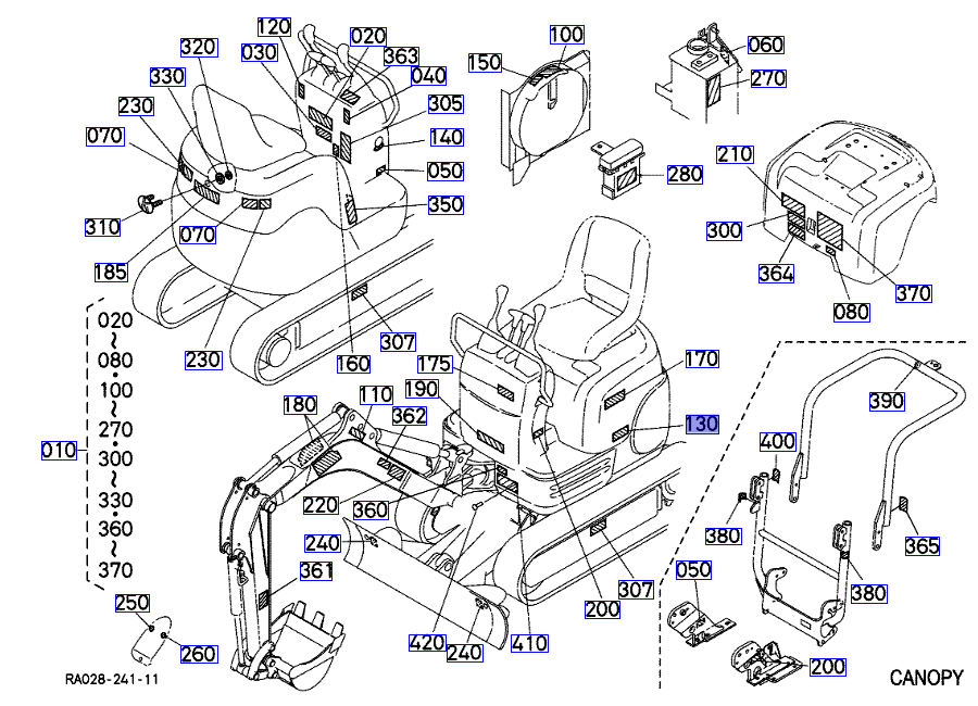 130 op de overzichtstekening, originele sticker dieseltank / brandgevaar Kubota RB23857360 || RB238-57360