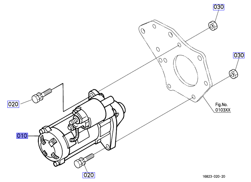 010 op de overzichtstekening, originele startmotor Kubota 1G02363010 || 1G023-63010