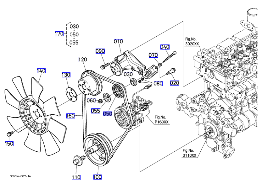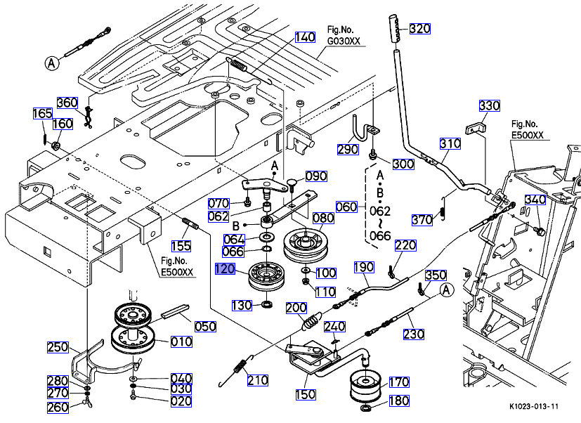 050 / 120 op de overzichtstekening, originele v-snaar poelie Kubota 1G77274320 || 1G772-74320