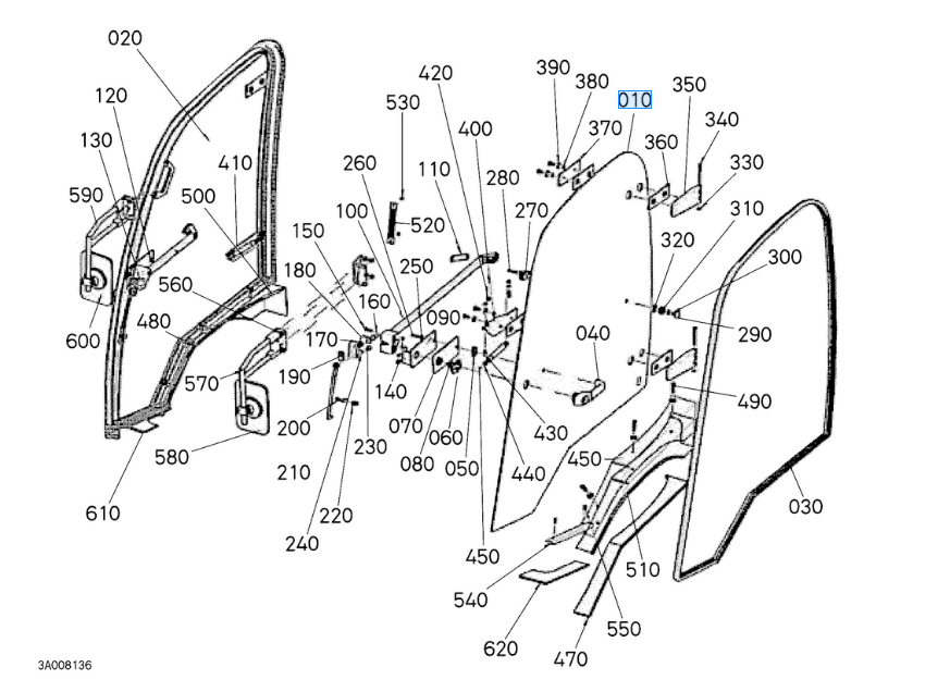 010 op de overzichtstekening, origineel deurraam links Kubota F2880 - F3680 W23TS00107 || W23TS-00107